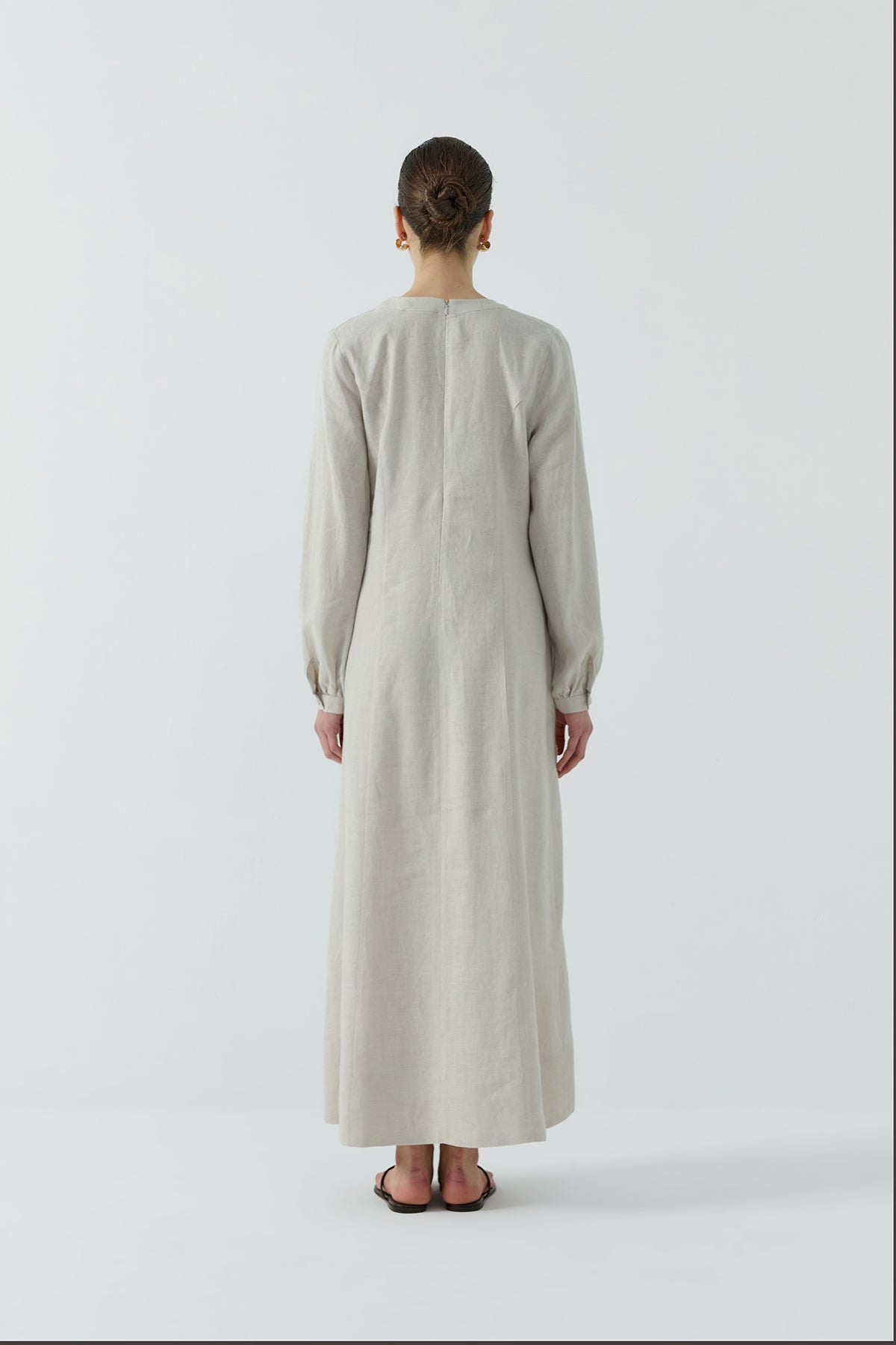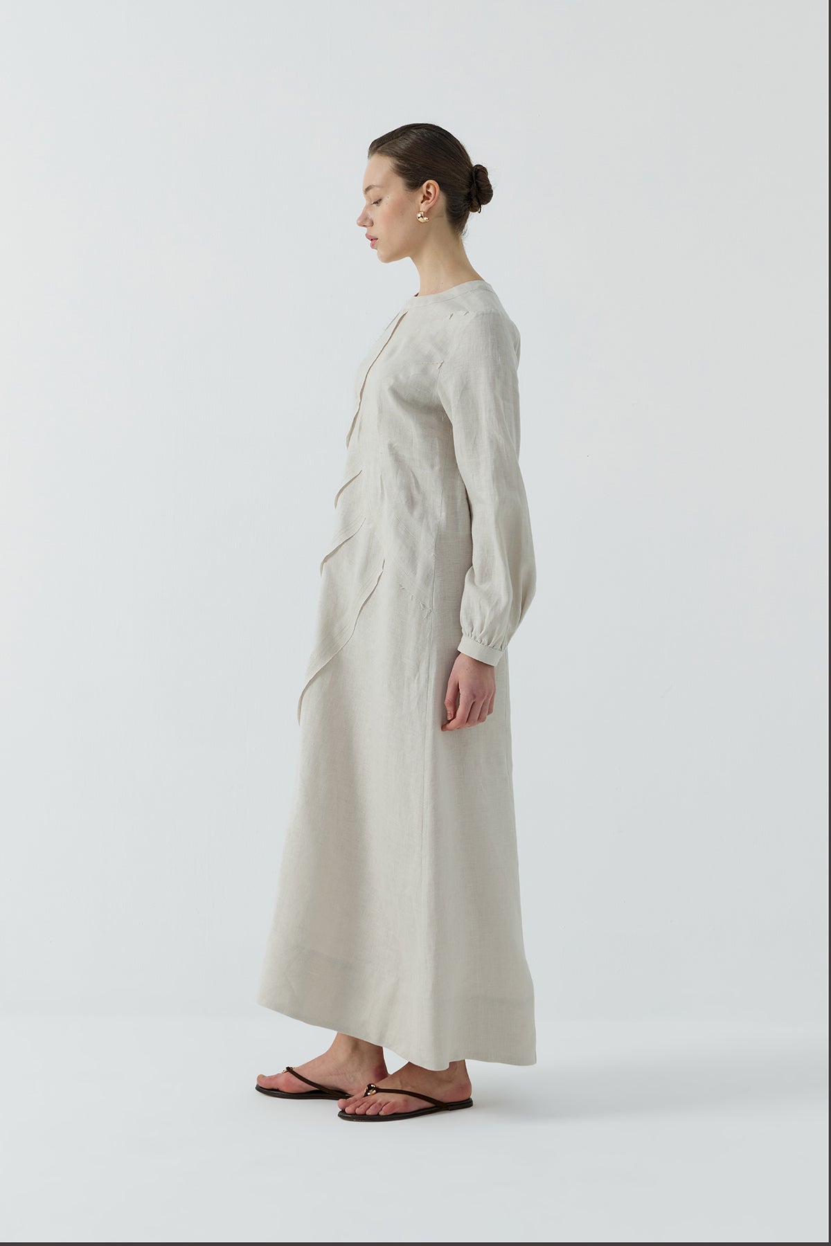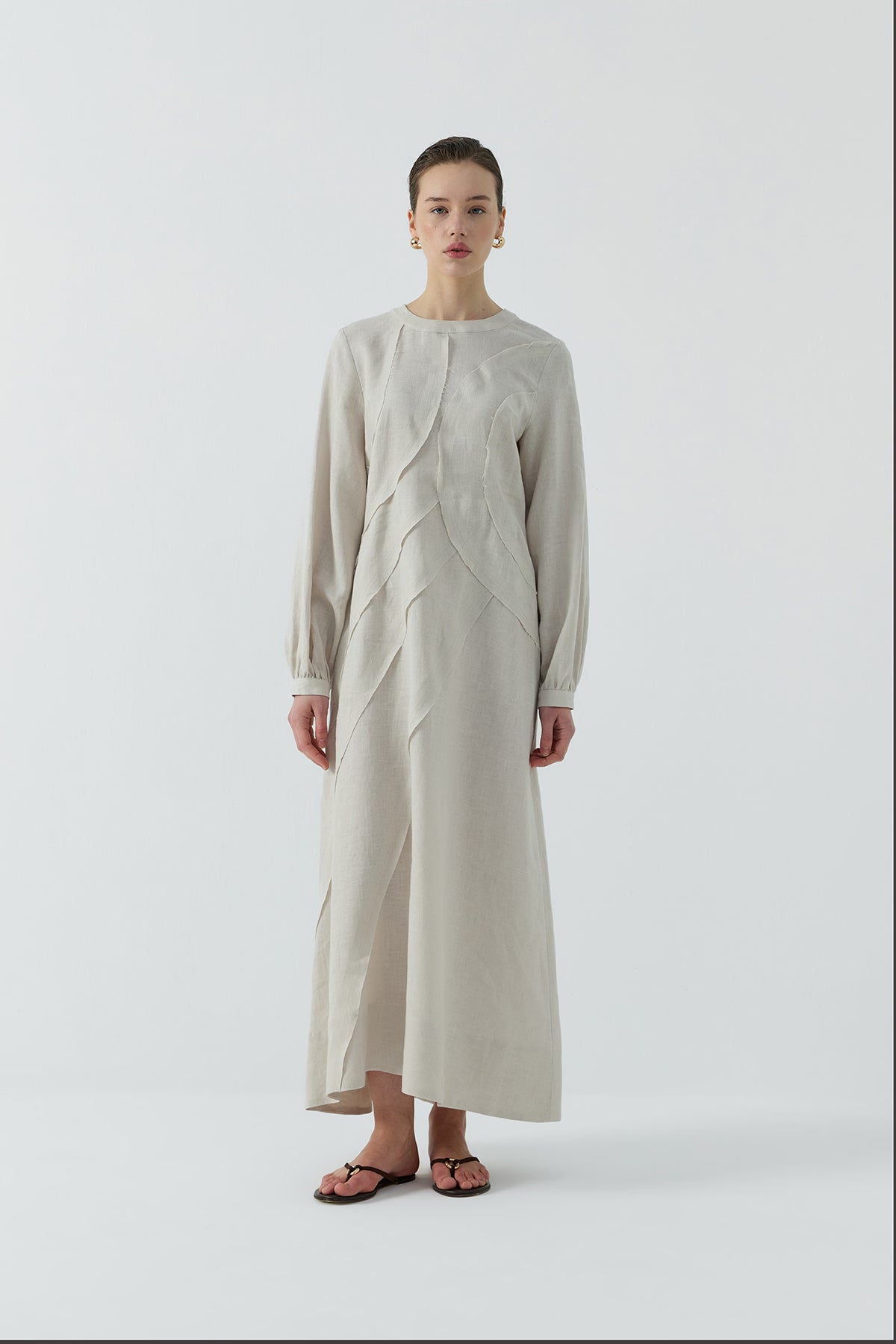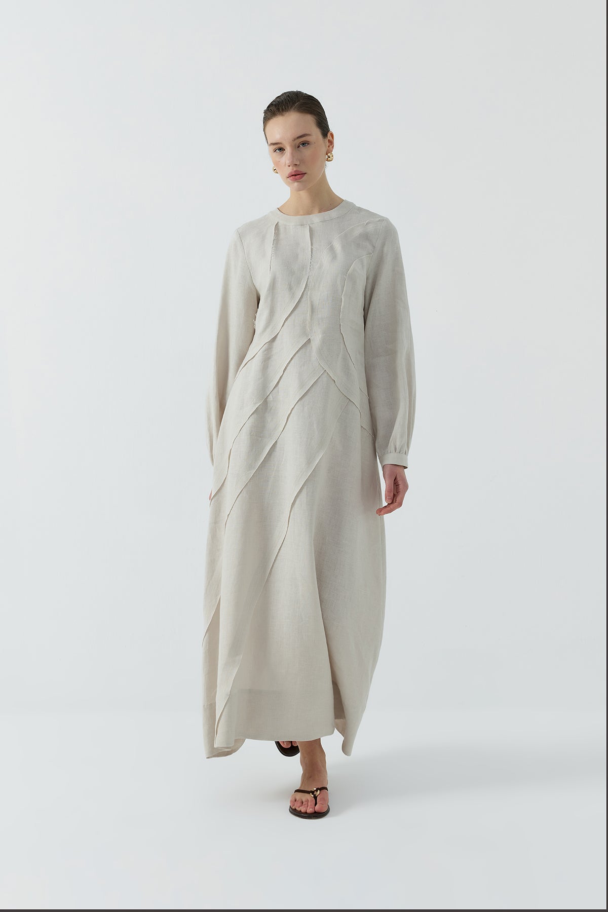 BEJ DIŞTAN DİKİŞLİ KETEN ELBİSE