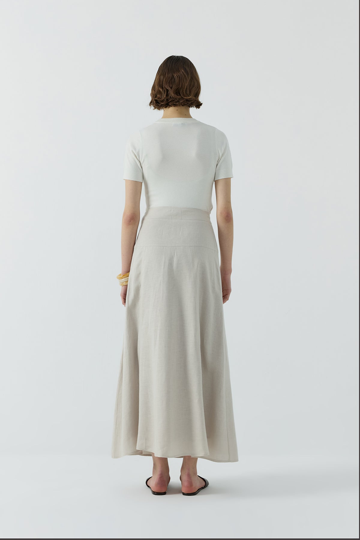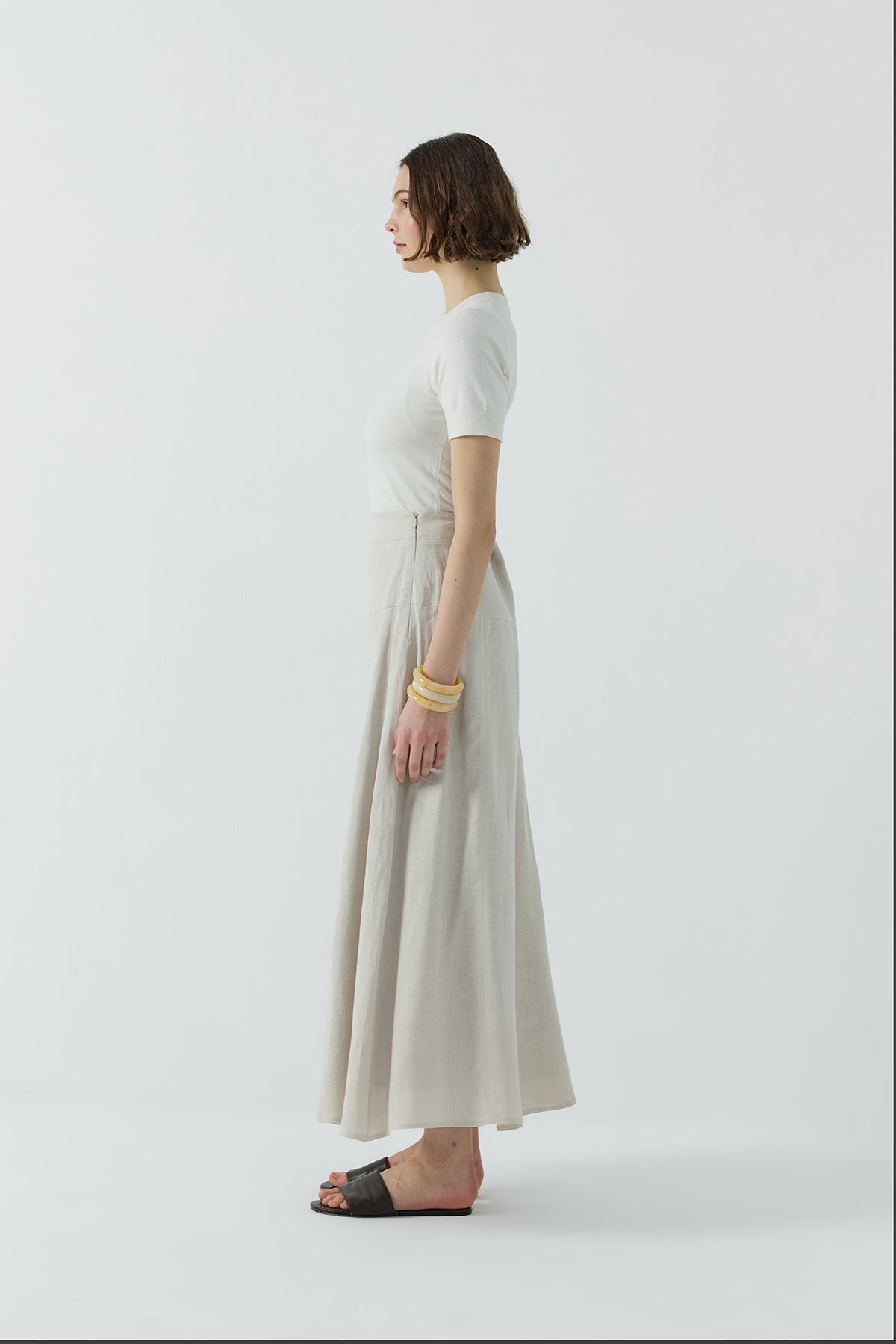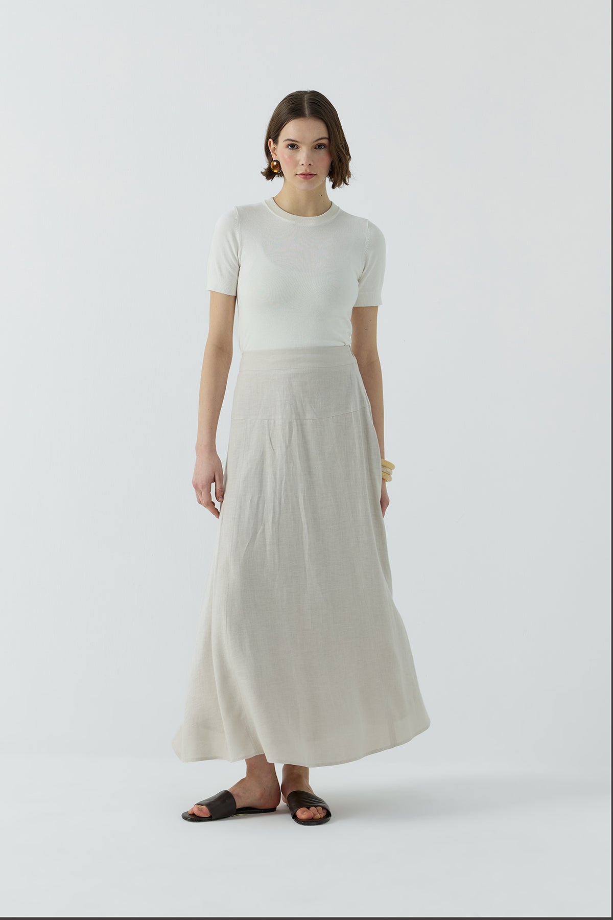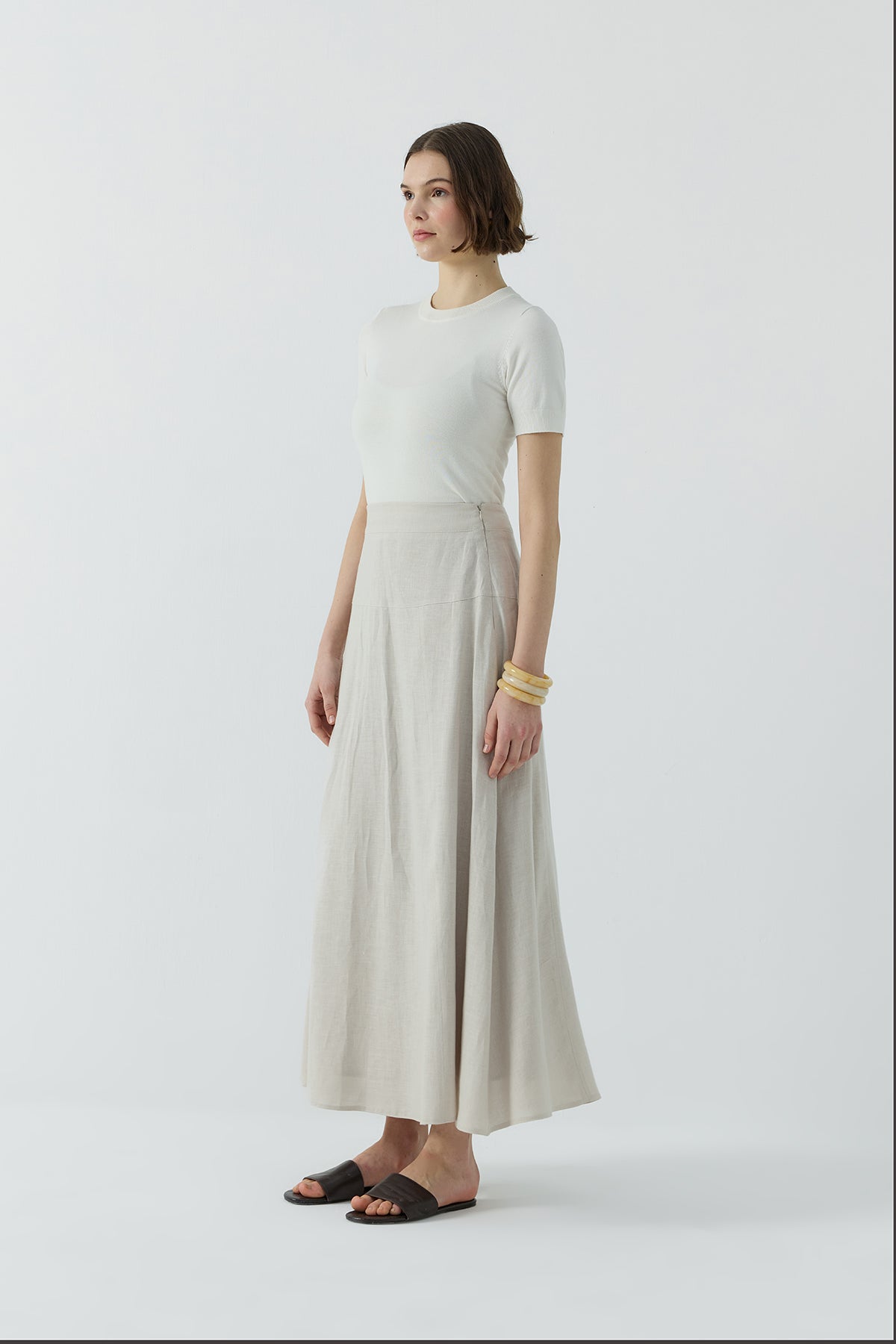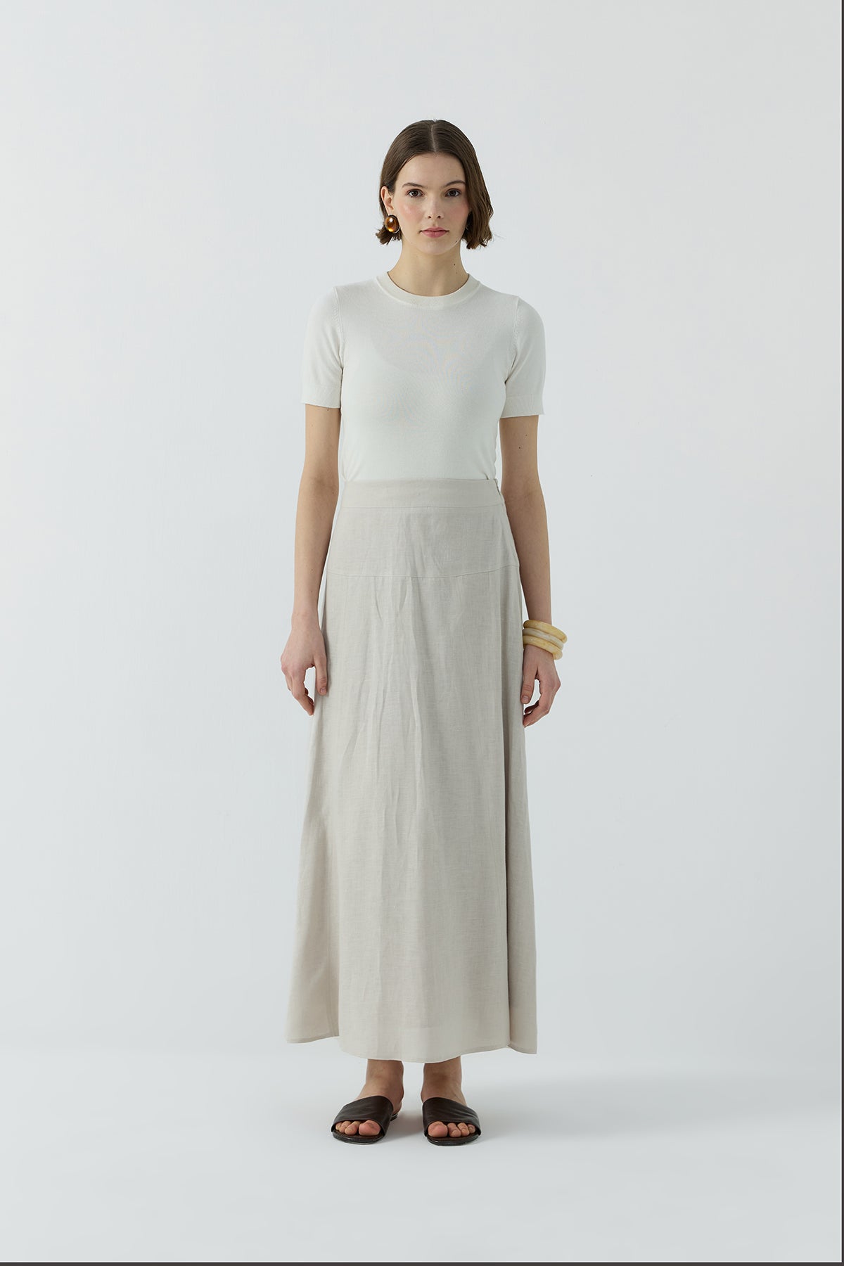 Ürün Açıklaması: Simli garnili. Uzun tasarım. Hafif çan. Yüksek bel. Arka gizli fermuarlı. Çift pileli.