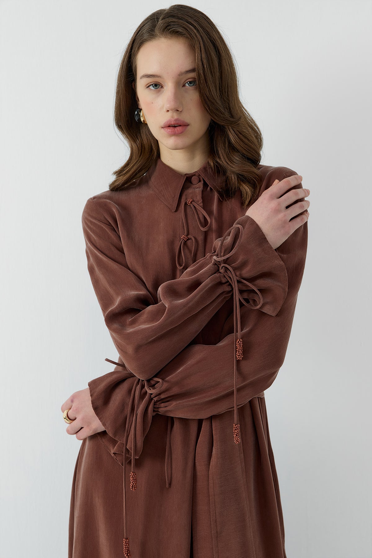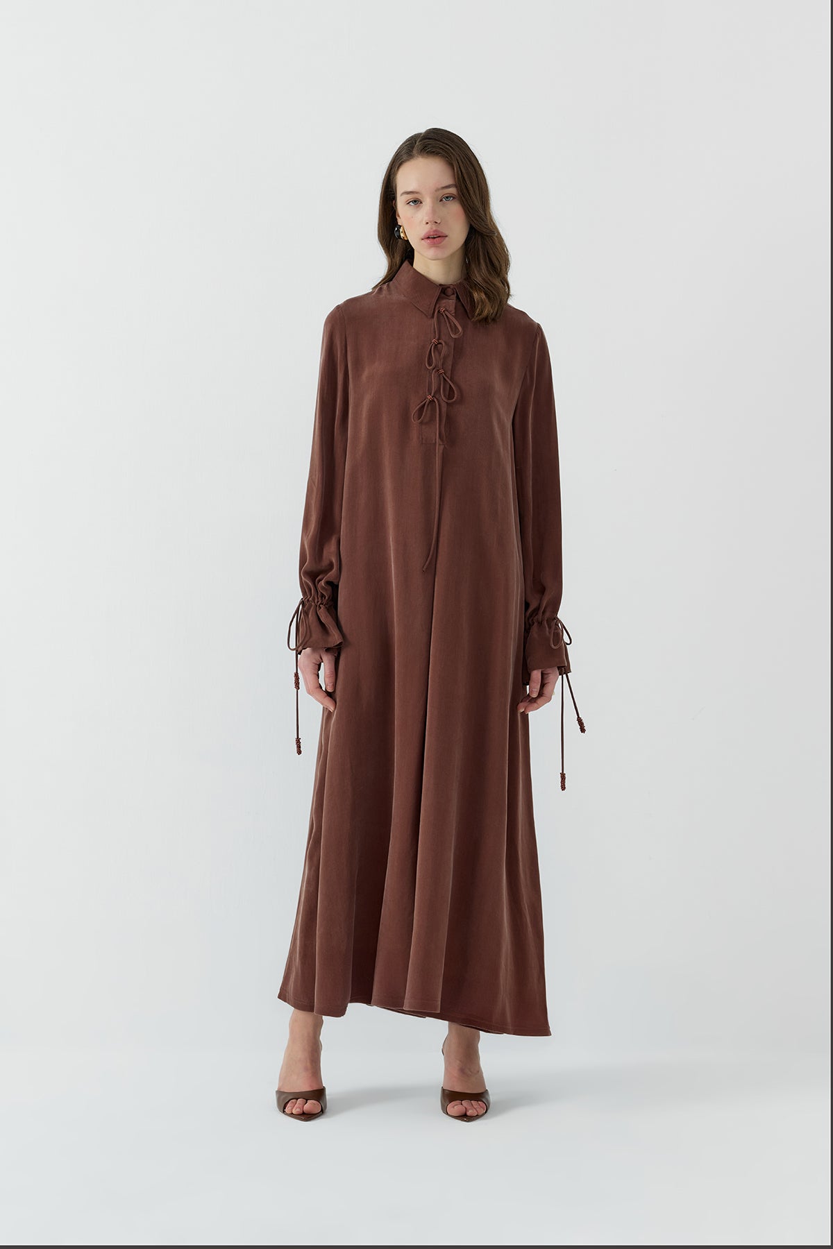 Ürün Açıklaması: Normal kalıp, yarım pat gizli düğmeli, ayaklı yaka, kol ve yaka biyelerinin uçları boncuk işlemeli ipek cupro elbise