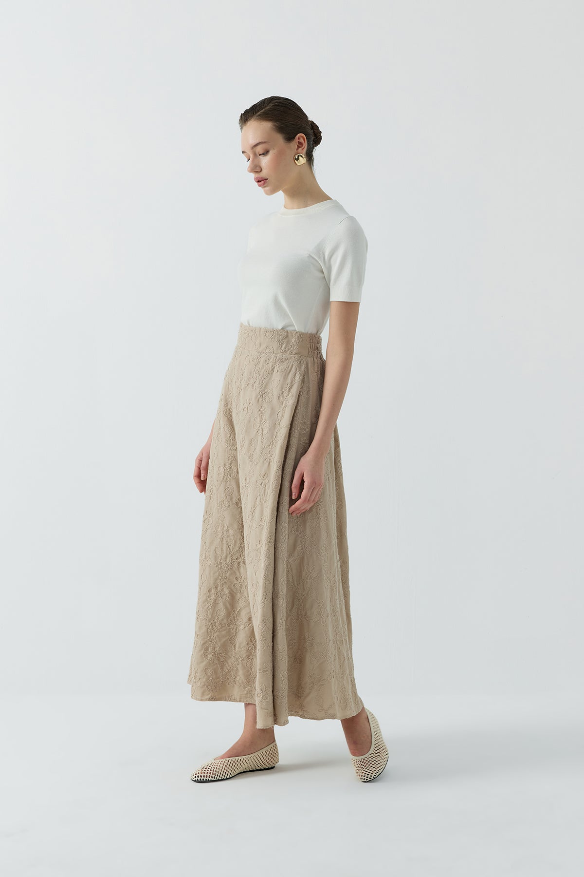 Ürün Açıklaması: Pamuk vual üzeri brodeli kumaş. Yüksek bel. Arka lastikli.